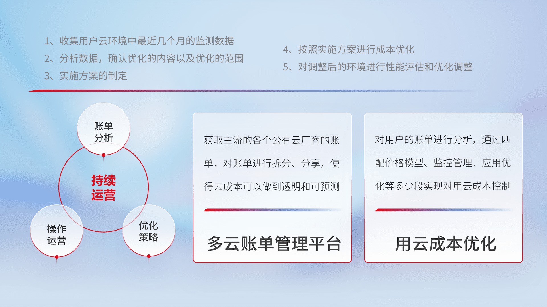 通过多云纳管,,以统一的资源数据模型把客户的云资源进行抽象和封装,,,,进而实现对多云资源的统一操作,,,保障云资源管理的可靠性、、、、稳定性与可用性。。。。量身定制化运维内容,,,,配置、、、、开发运维、、、补丁管理、、、、备份、、、、监控、、、、认证和访问管理、、、、审计和日常巡检等,,,保障在用云过程中的可靠度,,,,稳定度以及高可用率。。。。